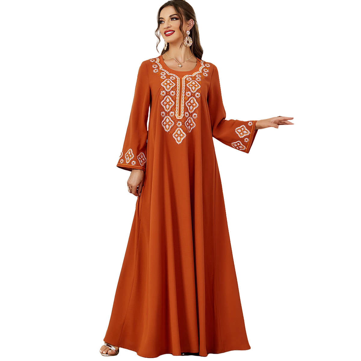 3567 Muslim Women’s Solid Color Embroidery Muslim Middle Eastern Women’s Arabic Clothing Long-Sleeved Dress