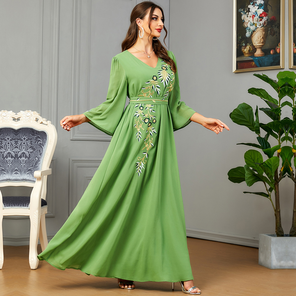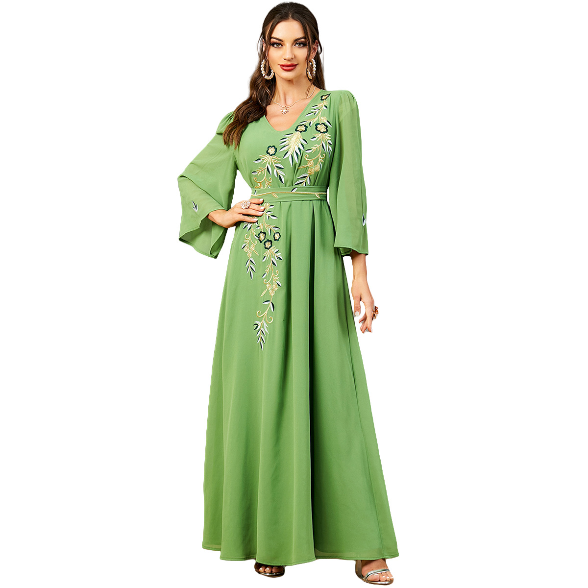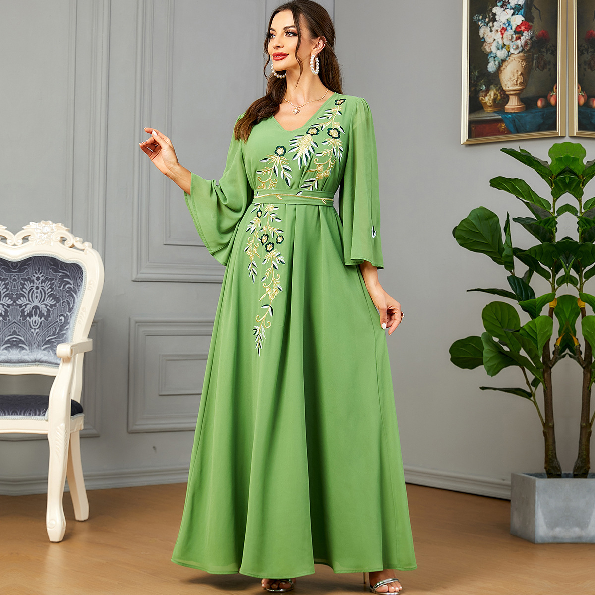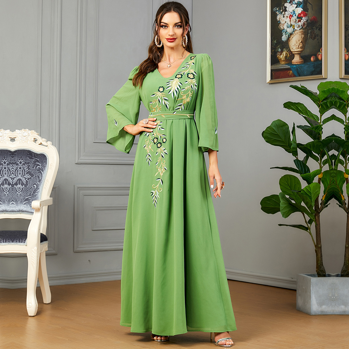 3586 Middle East Cross-Border Muslim New Women’s V-Neck Embroidered Chiffon Fashion Robe Arabic Dress