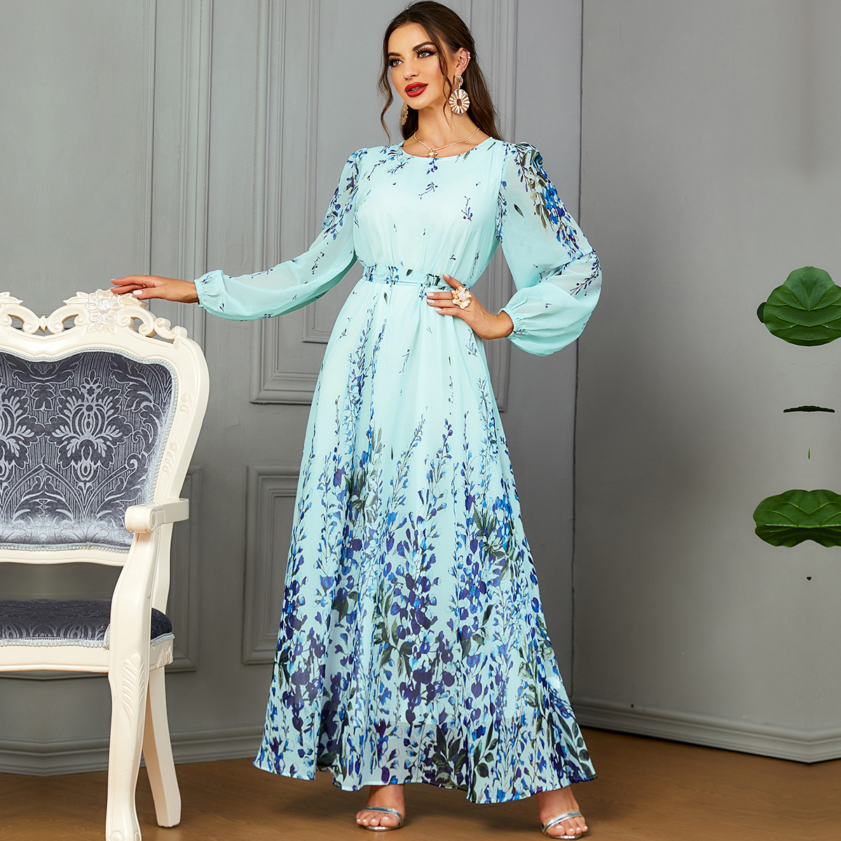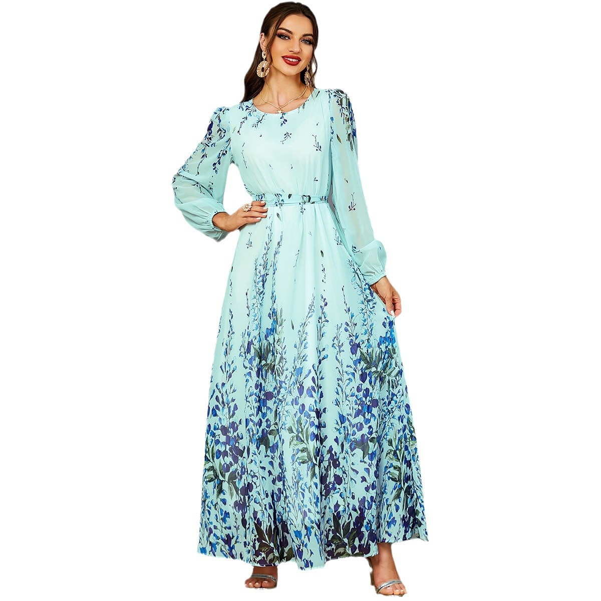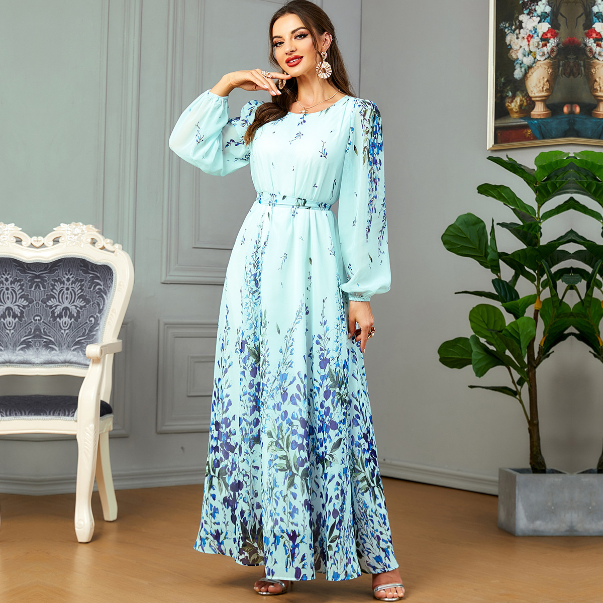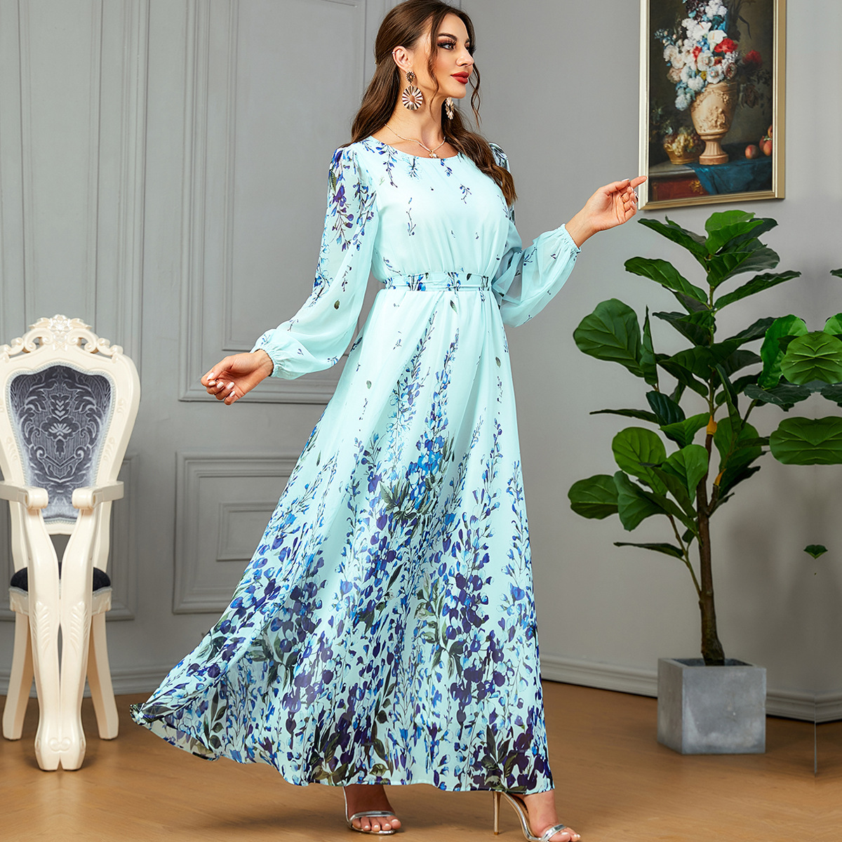 3595 Middle East Cross-Border Chiffon Fashion Digital Printing Muslim Women’s Robe Arabic Dress Belt