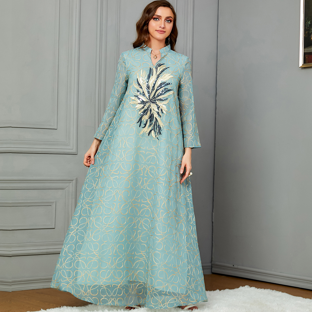 3649 Middle Eastern Arab Muslim Appliqué Robe Cross-Border European And American Foreign Trade Fashion Women’s Long-Sleeved Dress