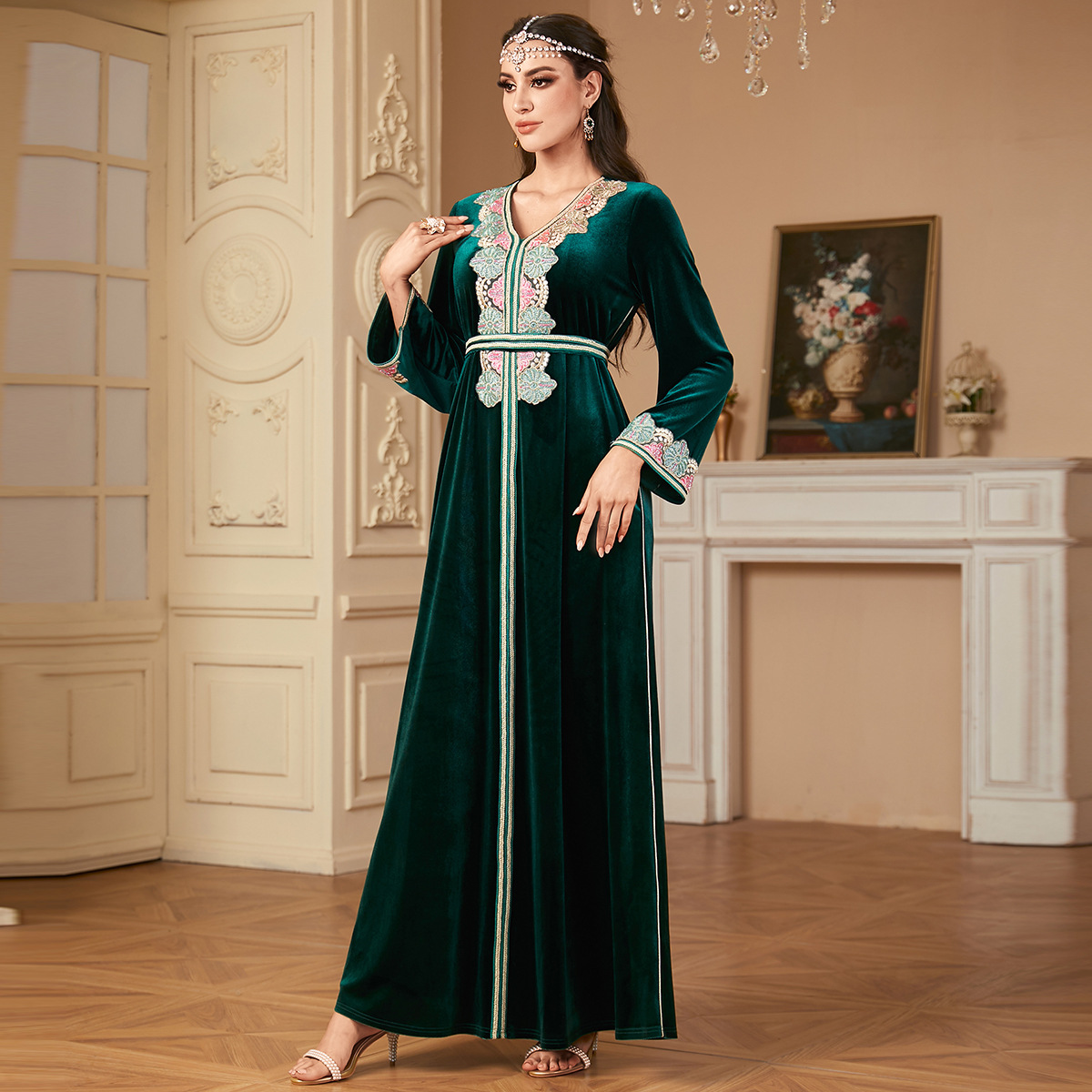 Be the first to review “3744 Middle East Cross-Border Dubai Muslim Robe Fashionable Embroidered Beaded Long Skirt Gold Velvet Dress”