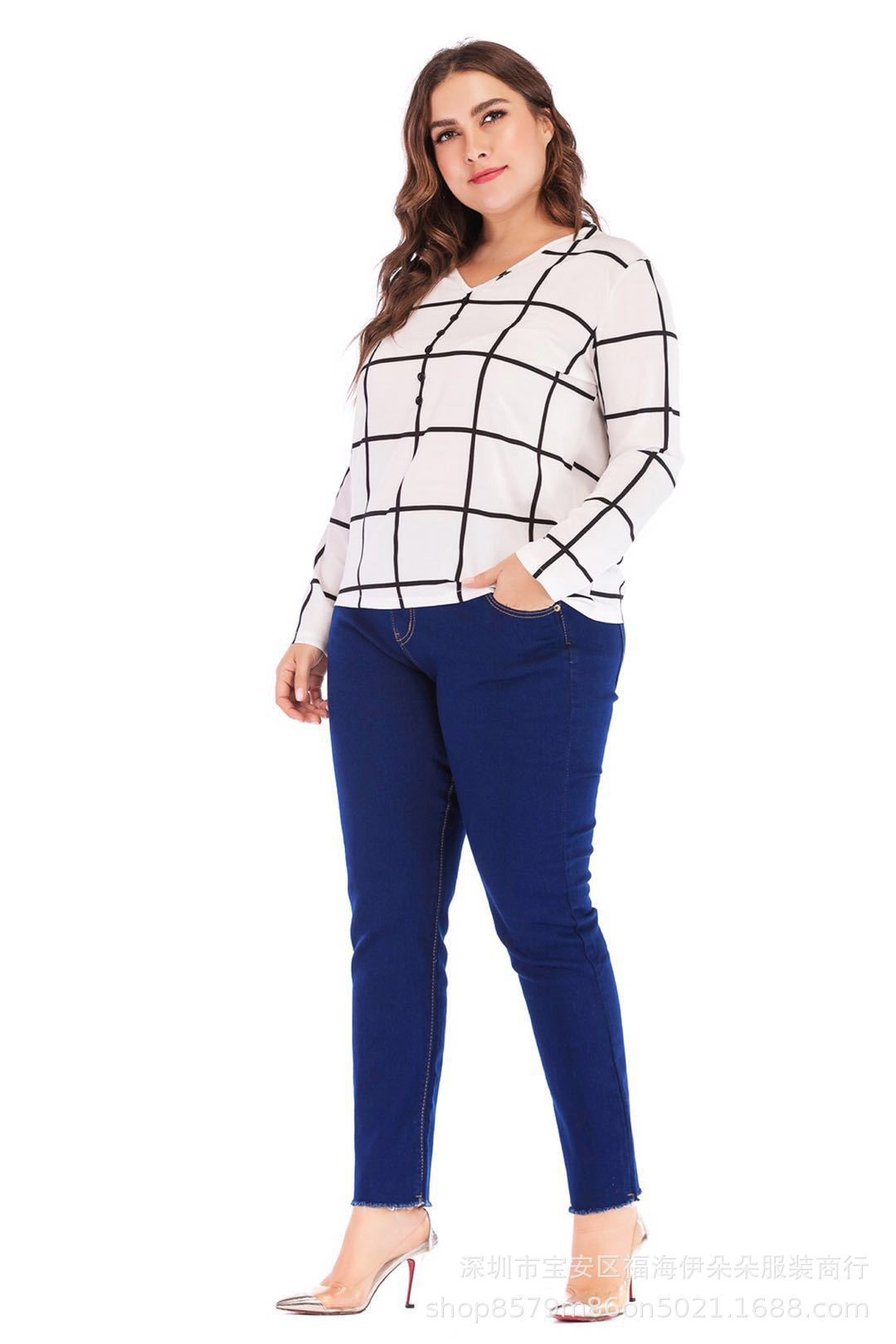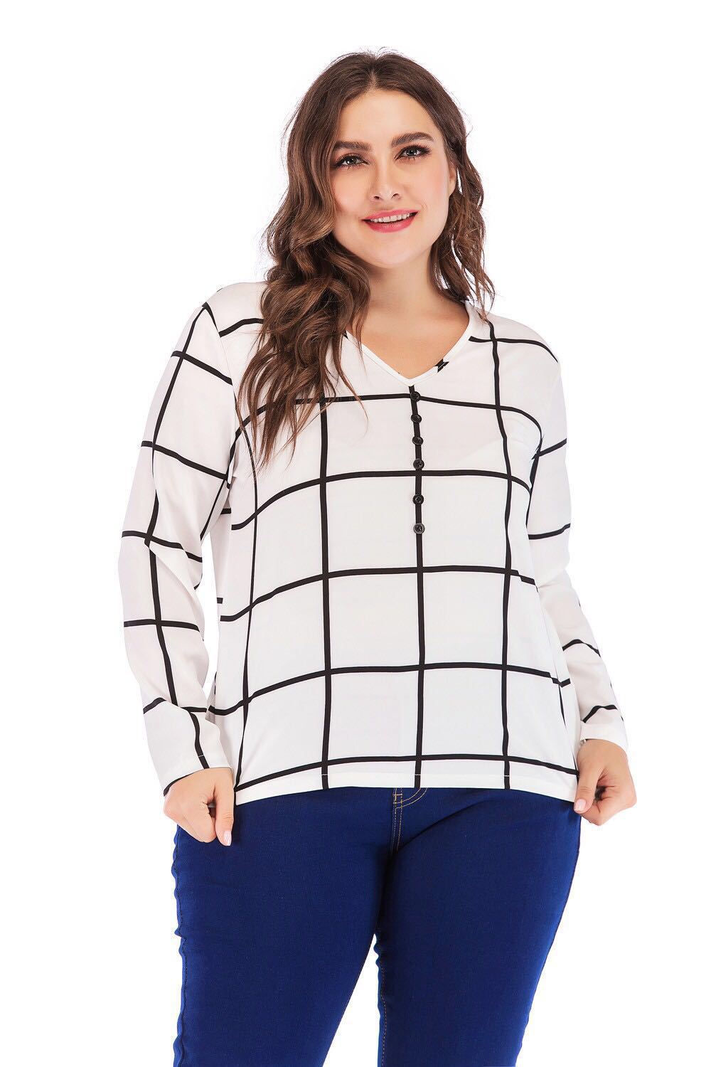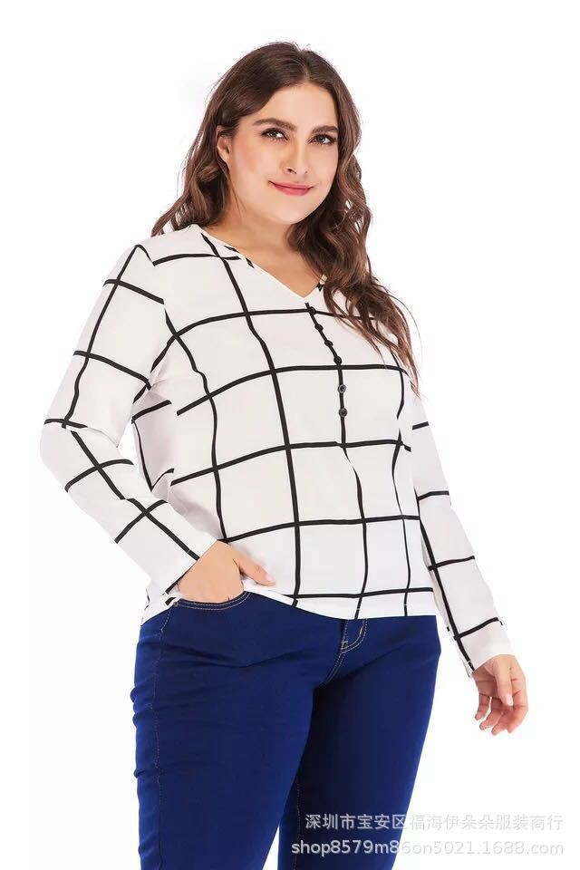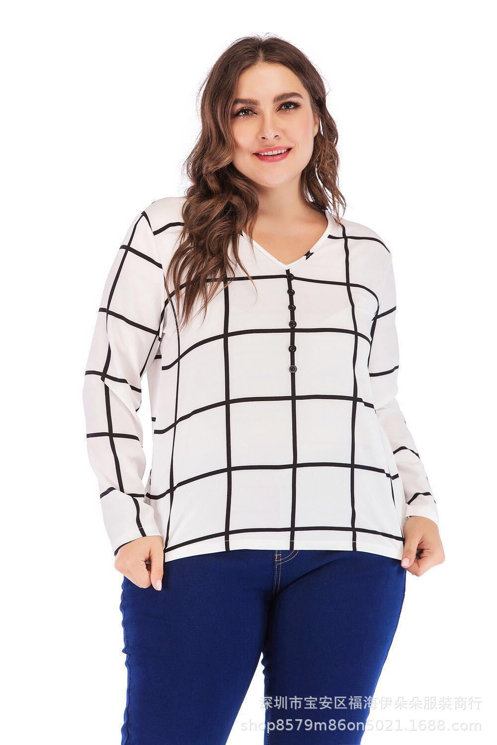 Directly From The Manufacturer, Iduoduo European And American Large Size Women’s New V-Neck Plaid Chiffon Tops Are Versatile, Slimming And Long-Sleeved 039